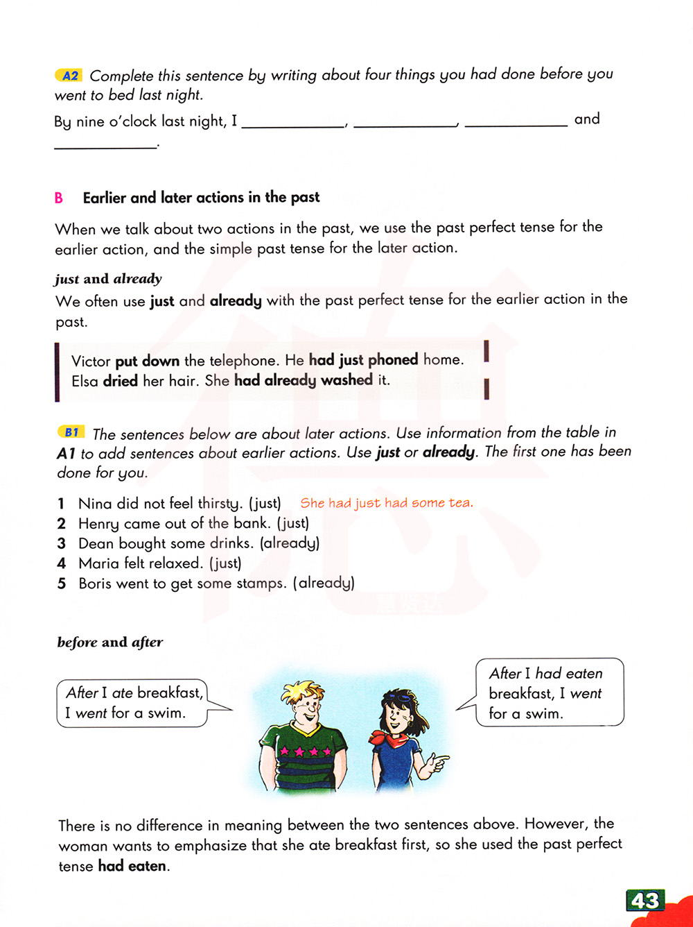 1 尼娜不觉得口渴。(只是)她刚喝过些茶。 2 亨利从银行出来。(只是) 3 迪恩买了一些饮料。(已)