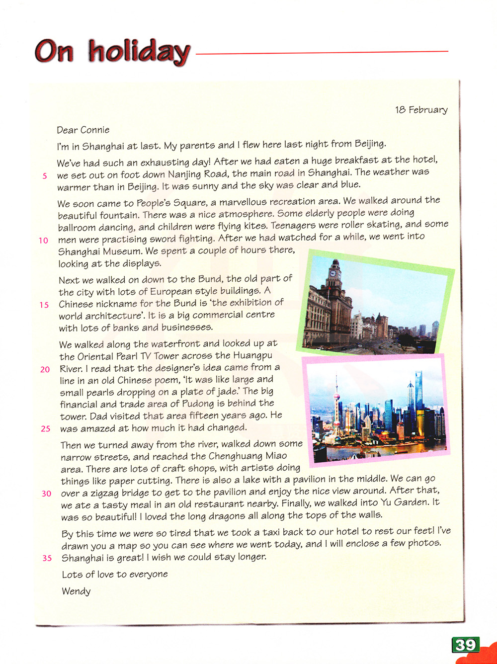 这时我们累得坐出租车回旅馆休息一下。我已经给你画了一张地图,你可以看到我们今天去了哪里,我会附上几张照片。上海很棒!我希望我们能待得更久。