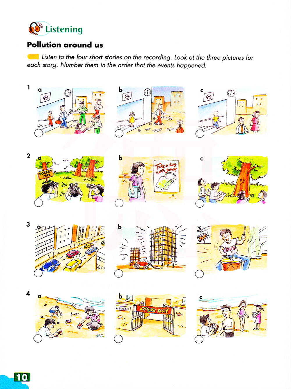 听录音上的四个短篇故事。看这三张图片的每个故事。按事件发生的顺序编号。
