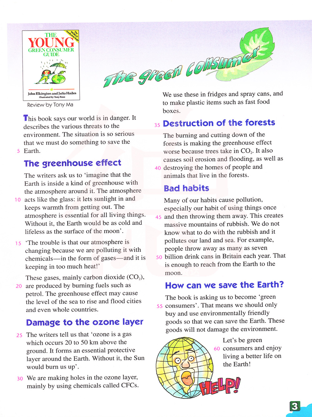 这本书要求我们成为“绿色消费者”。这意味着我们应该只购买和使用环保产品。这样我们才能拯救地球。这些商品才不会破坏环境。