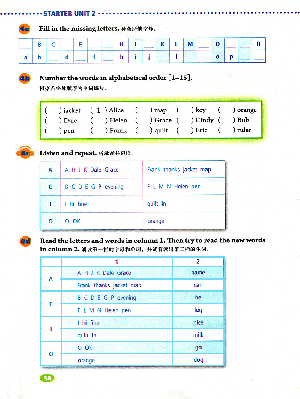 朗读第一栏的字母和单词,并试着读出第二栏的生词。