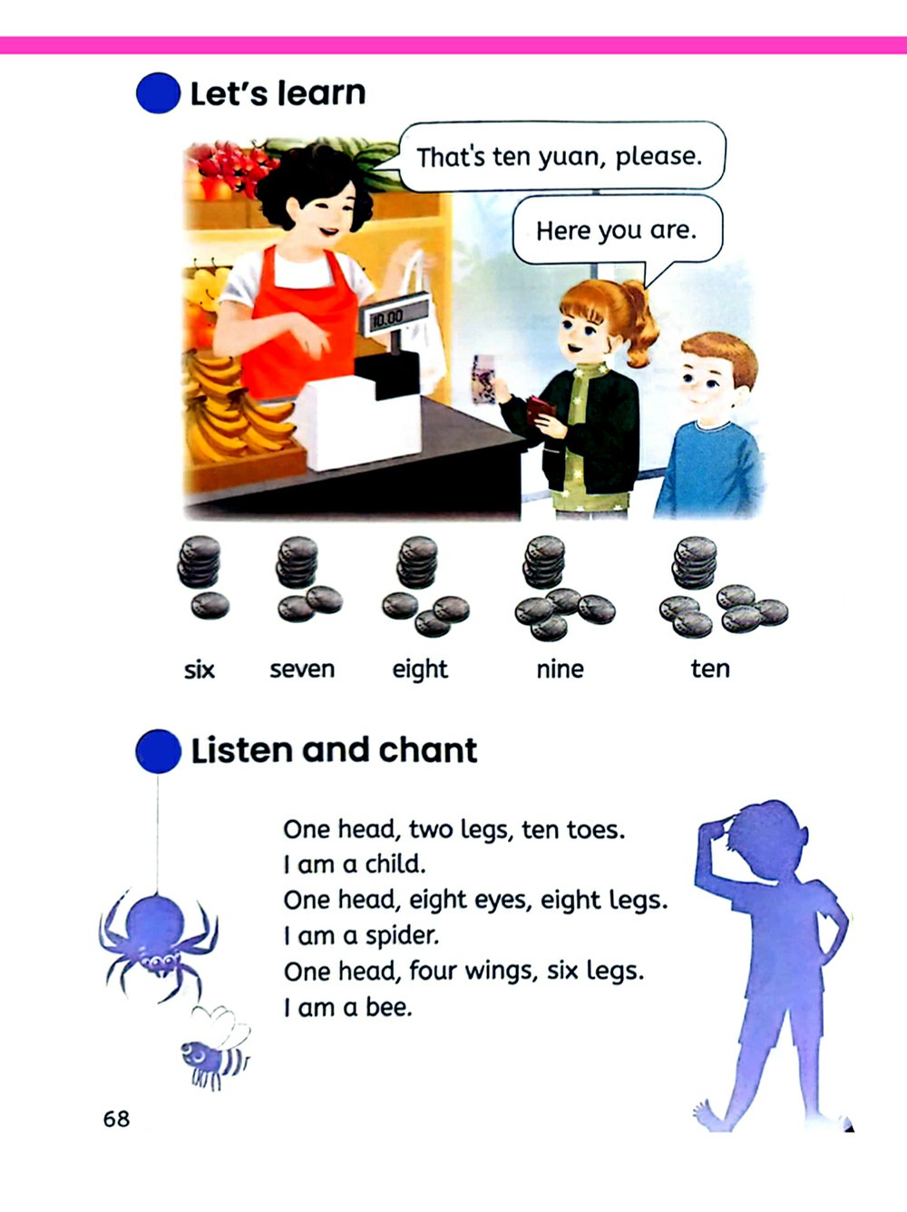 一个脑袋 两条腿 十根手指头。 我是一个小孩。