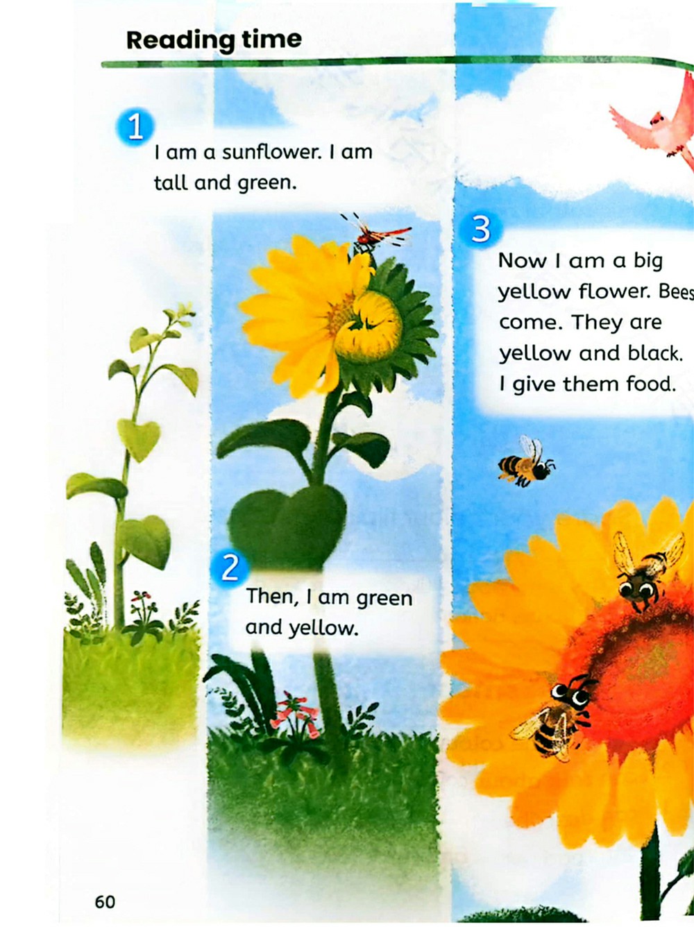 现在我是一朵大大的黄花。 蜜蜂来了。它们是黄黑相间的。 我给它们食物。