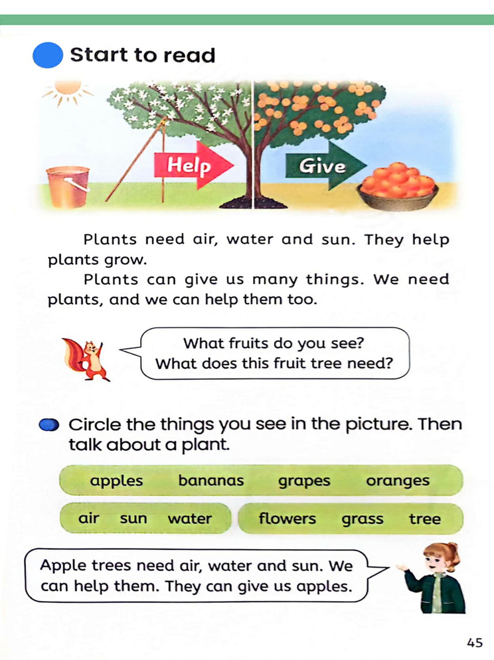 苹果树需要空气 水和阳光。我们可以帮助 他们。它们可以给我们苹果。
