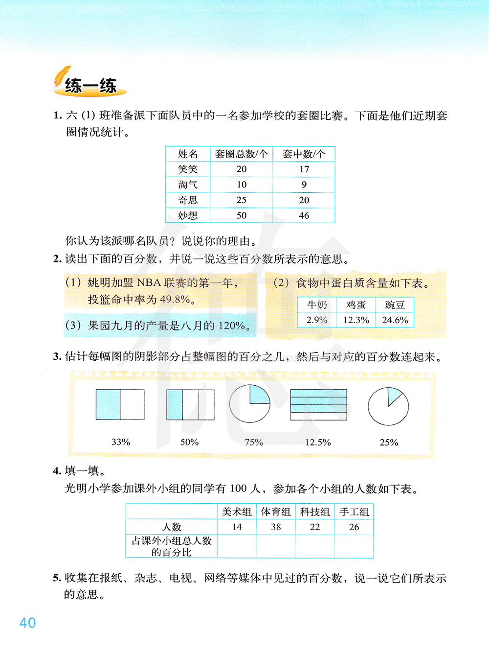 1、求常见的百分率,如:达标率、及格率、成活率、发芽率、出勤率等求百分率就是求一个数是另一个数的百分之几。
