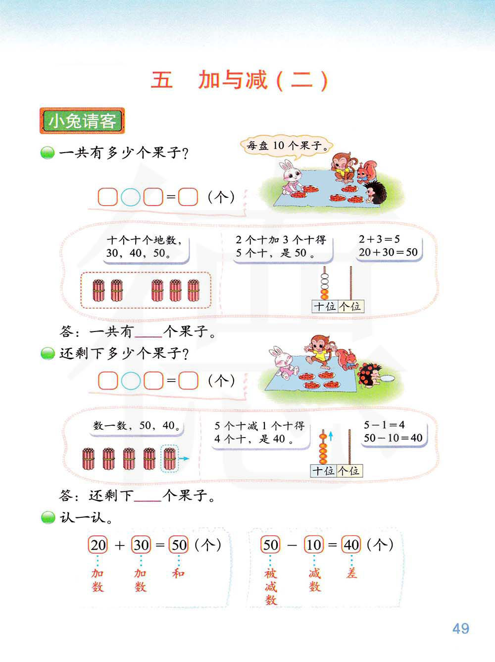 1、掌握100以内数的不进位加法、不退位减法的计算方法,并能正确计算。 (1)整十数加减整十数 (2)两位数加减一位数 (3)两位数加减整十数 (4)两位数加两位数 (5)两位数减两位数 2、在具体情境中提出问题和解决问题的过程。