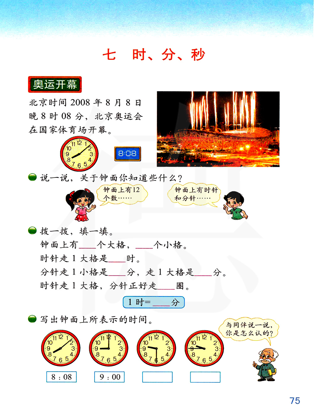 结合情境认识钟面;初步了解时、分以及它们之间的关系。